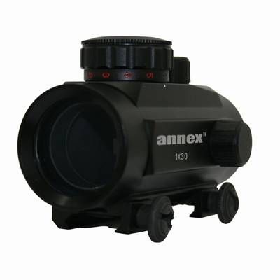 Optische Zielhilfe von Annex, welche drei rote oder grüne (wählbar) Lichtpunkte in die Linse projeziert um eine einfache und schnelle Zielerfassung zu ermöglichen. Das System wird über eine Batterie betrieben und ist horizontal wie vertikal einjustierbar. Das Rotpunktvisier passt auf alle gängigen Markierer mit Picatinny-Typ (20mm) Visierschiene. Wegen der niedrigen Siluette vorallem geeignet in Kombination mit Carry Handle (Visierschinenerhöhung).