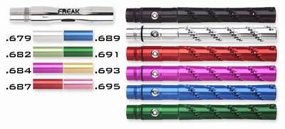 Das FreakSet gehört zu den ersten und immer noch zu den besten Laufsystemen die es gibt. Das System ist absolut offen, so daß man den Lauf z.B. durch Tauschen des hinteren Adapters an verschiedenen Markierern spielen kann. Die Hülsen die in dieses Teil geschoben werden, haben die Aufgabe, sich genau dem Durchmesser der Paint anzupassen und so immer ein bestmögliches Schußbild zu erzeugen. Der vordere Teil kann ebenfalls ausgetauscht werden um sich der Spielposition oder auch dem persönlichen Geschmack anzupassen.