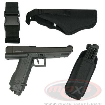 Das Tiberius 8 Players Pack besteht aus der Tiberius 8 Paintballpistole, einem Pistolen Holster speziell für die Tiberius 8, einem Ersatzmagazin und einem Holster für das Ersatzmagazin.
