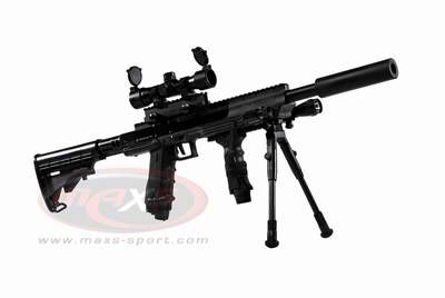 Die Tiberius 9 Elite besteht aus der Tiberius 9 Paintballpistole, einer Front/Laufverlängerung, einem Frontgriff, einem Adapter für grosses Magazin, einer ausziehbarerer Schulterstütze, einem Adapter für Remote System, einem Viesier Aufsatz, einem ausklappbaren Zweibein, einem Snyper Lauf und einem Rotpunkt Visier.